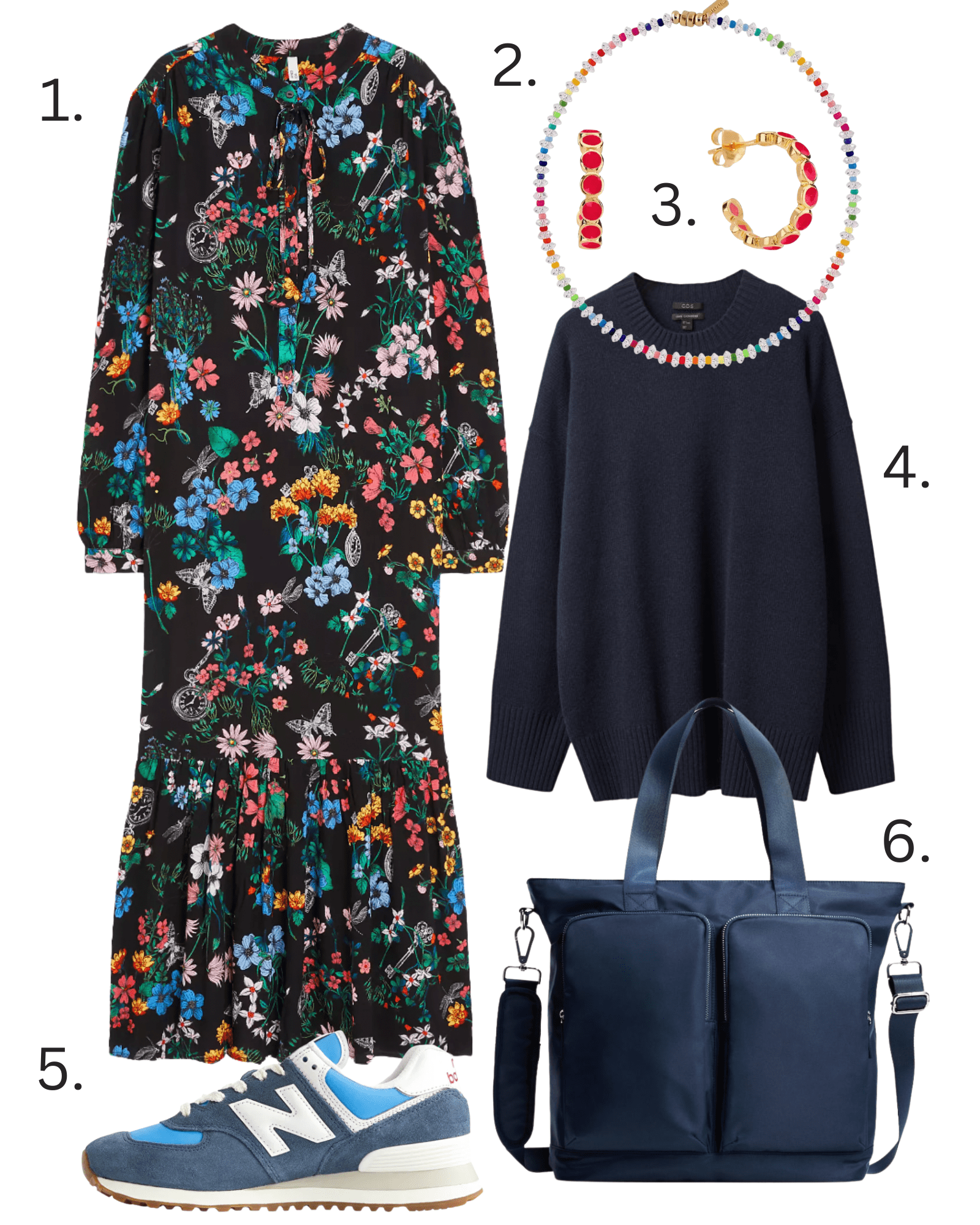 Layer your navy jumper over your dress instead of wearing a coat or jacket. Add secret leggings if it’s not warm enough for a bare leg underneath.