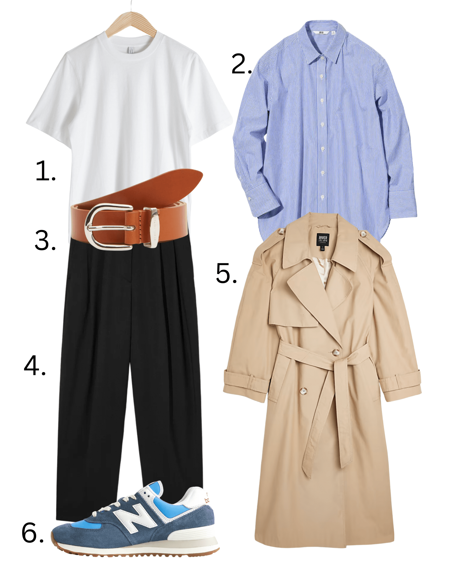 PLAIN T‑SHIRT: White or black, depending on which you prefer. I’d go for a boxy white T‑shirt, slightly oversized so I can tuck it in. My favourite is this one from & Other Stories.