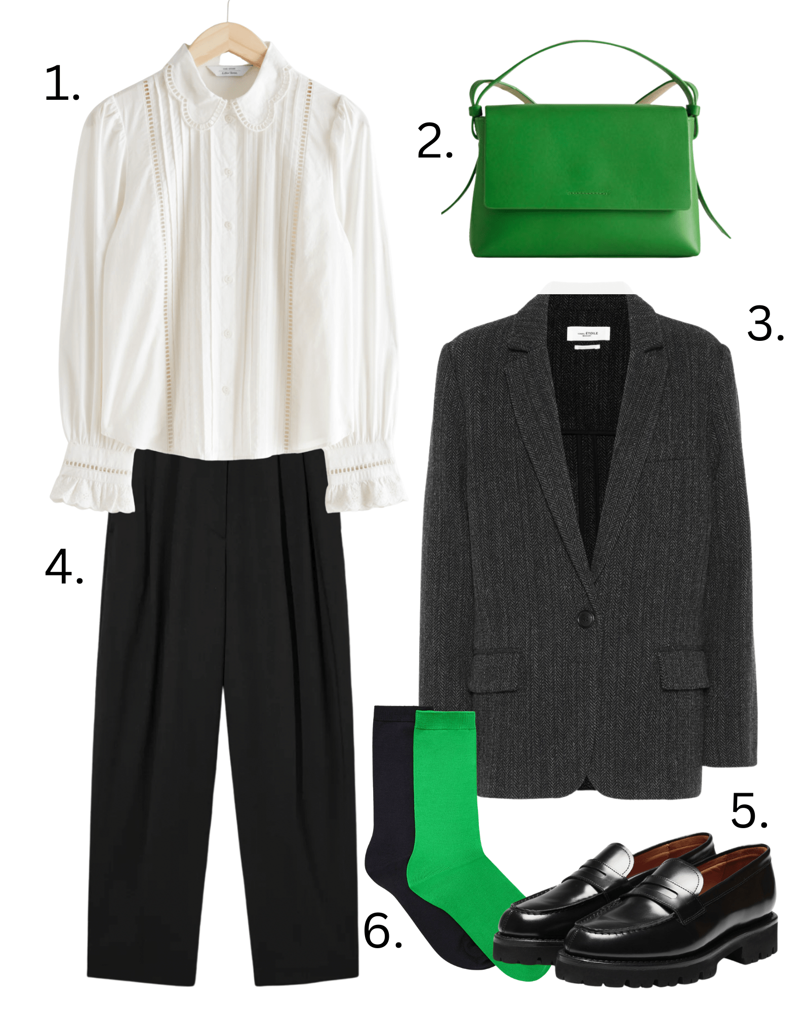 One for work. Pair your nice blouse with your tailored trousers and add the blazer, loafers and a really good pair of socks. Of course it’s completely up to you if you match your socks to your bag. You know I would.