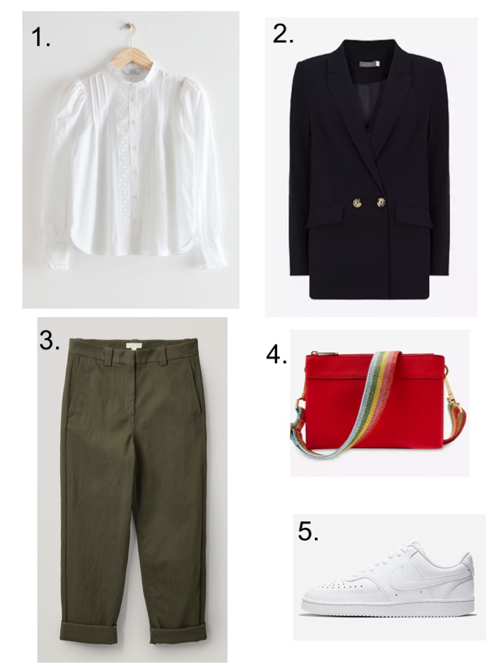 The white blouse, navy blazer, khaki trouser, white trainer combo. It says, ‘I’m kind of smart, I’m looking profesh, yet also a bit girly but I can still walk long (social) distances in my comfortable trainers’. The colourful bag is quite often the key to making a basic outfit just that bit more interesting, which is why I think it’s worth investing in a good one that will last. See also shoes. As I’ve always said, spend your money on good bags or shoes, because you’ll never get too old or too fat for them. I realise I’m probably not supposed to even use the words old or fat these days, but sometimes it’s the only way.