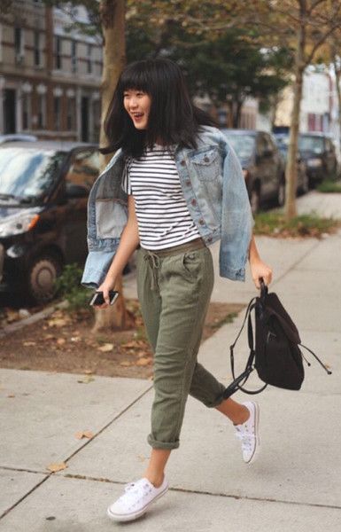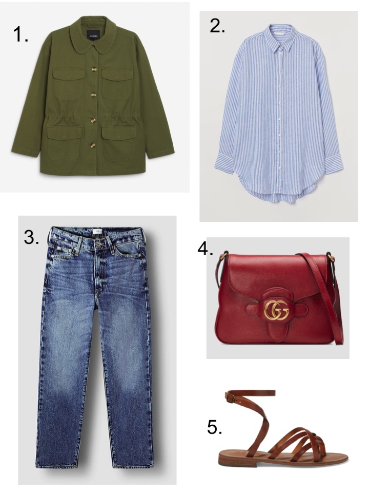 Of course we’d all love to look as effortlessly chic as Emmanuelle Alt (above). She has that elusive French style that I often try to emulate but can never quite convincingly pull off. But wearing your khaki jacket, with your straight leg jeans, blue shirt and fancy handbag will get you over halfway there, I reckon. Don’t underestimate the simple blue striped shirt. I’ve had a version of this H&M one for 10 years now and it comes out every summer. Perfect with your khaki trousers too, and even as a cover up on the beach.