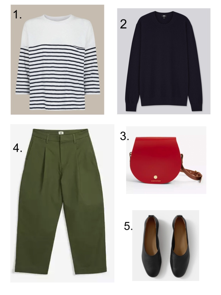 Ahh, the Breton. Surely there cannot be a middle-aged lady in the land who doesn’t own at least 3 of these. For good reason. A very easy everyday wardrobe staple. Works perfectly with jeans, dungarees, khakis, prints, everything basically. I wrote a whole post on it a while back if you’re looking for more inspiration. When you’re on the hunt for a good navy jumper, do take a look at the men’s departments of your favourite shops. All of my jumpers from Uniqlo are from the men’s department because I can’t abide anything too ‘lady fit’. Same goes for T‑shirts too. Don’t come to my door brandishing a scoop neck, cap sleeve, lady fit number, I will only have to turn you away…