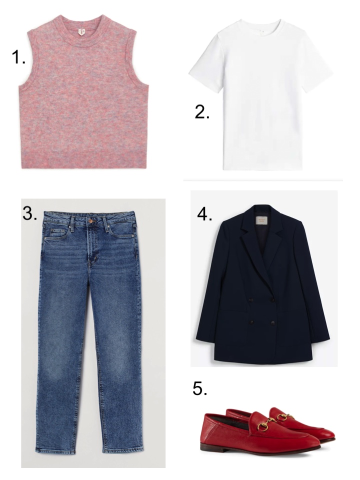 Finally, the white T‑shirt, tank top, jeans and navy blazer combo. Add your best shoes for the full effect. I’ve mentioned the Gucci loafers many times before. A HUGE investment purchase I grant you, but will never ever date. They’ve been making them since the dawn of fashion time so you know they are never going to go out of style. Super comfortable. I’ve had mine since 2016 and they’ve never given me a day of trouble. Cost per wear so far, I’m looking at around £15. That would have gone down considerably had we actually been able to leave the house over the past year. Check out the ‘Shoes that aren’t trainers’ blog for alternatives at other price points.