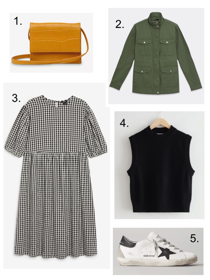 The gingham dress, tank top, khaki jacket and trainers. I’d say the tank top/sweater vest/whatever you want to call it is THE fresh new addition to your wardrobe for 2021. I’ve obviously fully bought into this trend. I don’t know why I never thought of it before. It’s the perfect way to get more use out of your summer dresses when the weather is not quite warm enough. On the flipside, a tank top works perfectly with spring jackets as there’s no bulky sweater arms to squeeze into the sleeves. It also frees the armpits for anyone in a peri/menopausal state. If you know, you know…