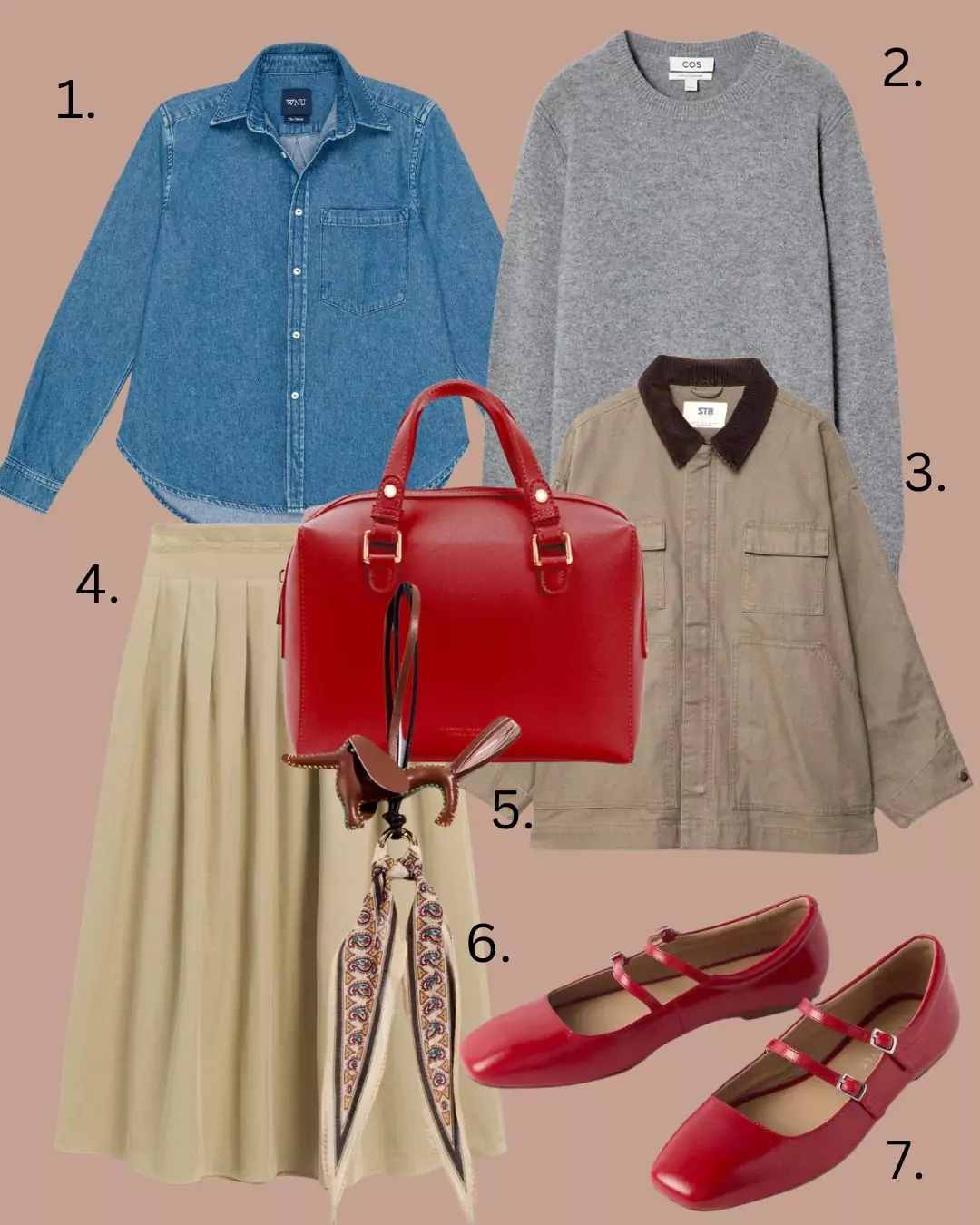 If you’d like to add some colour to this otherwise fairly muted outfit, you can do that with your accessories. Doesn’t have to be red: you could go for any colour, or even mix it up with a little bit of leopard print.
