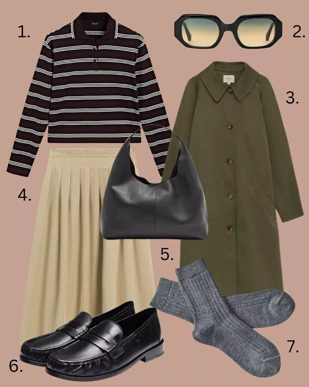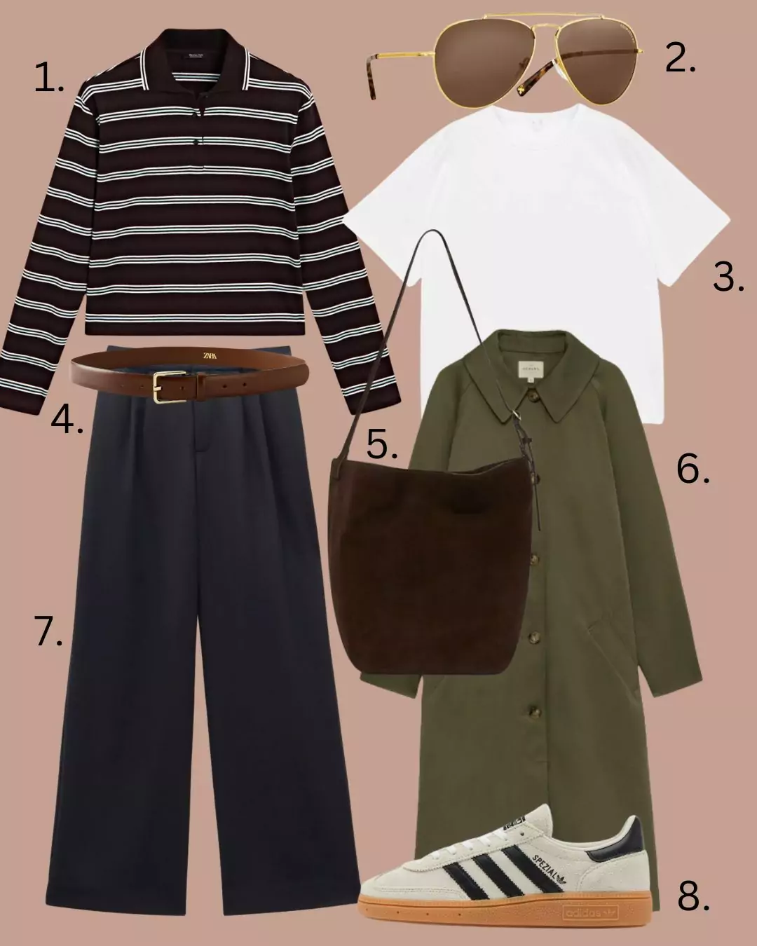I think it’s the combination of the on-trend polo-style stripes and the French-girl chic trench coat that I like the most here. A super-easy look that would work for anyone.